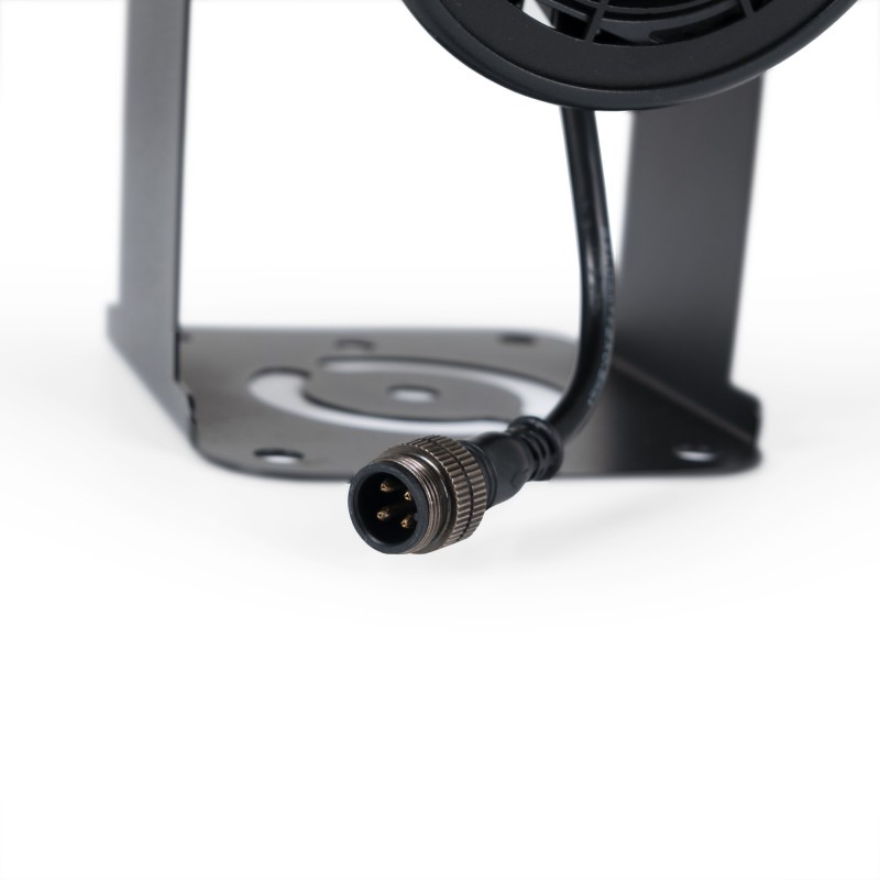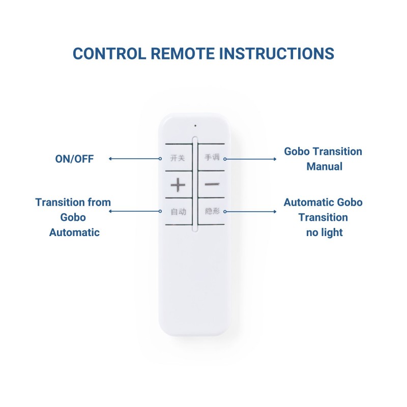 - Télécommande : permet d'allumer et d'éteindre le projecteur, ainsi que de gérer le changement de lentilles grâce à différentes options : changement manuel, changement tous les temps prédéfinis ou changement automatique, le projecteur s'éteignant entre chaque changement. Les piles de la télécommande ne sont pas incluses.