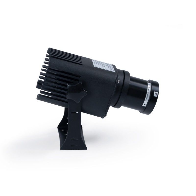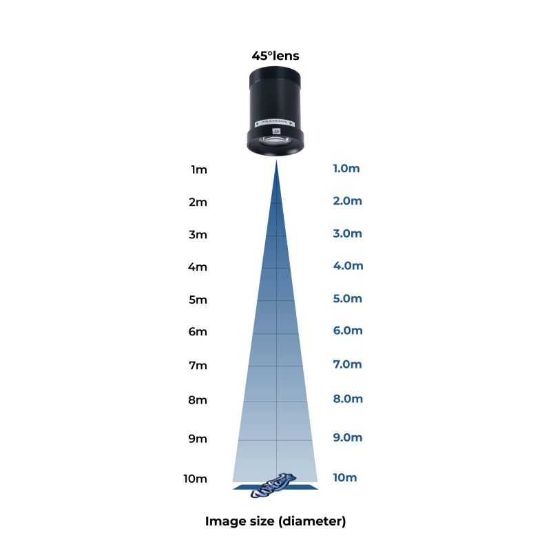 - Optique 45° : équipé d'une optique 45°, ce projecteur offre une large couverture, idéale pour mettre en valeur des logos et des messages sur de grandes surfaces et des surfaces diverses. D'autres options optiques sont disponibles (voir produits connexes).