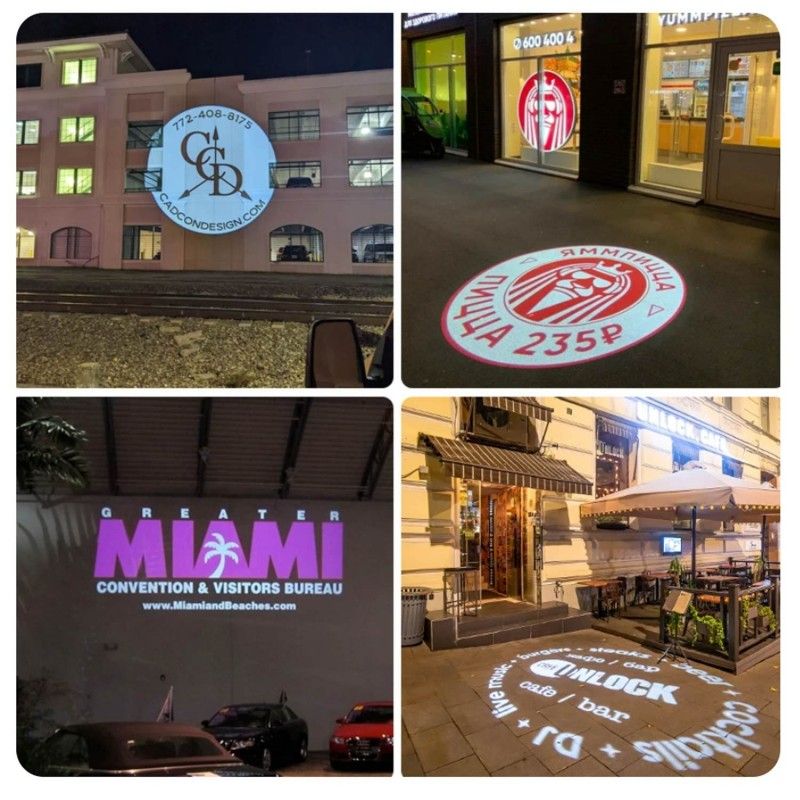 Le projecteur de logo extérieur projette des images et des logos clairs et de haute définition avec une visibilité de 5 à 15 mètres dans l'obscurité et de 3 à 4 mètres à la lumière du jour.