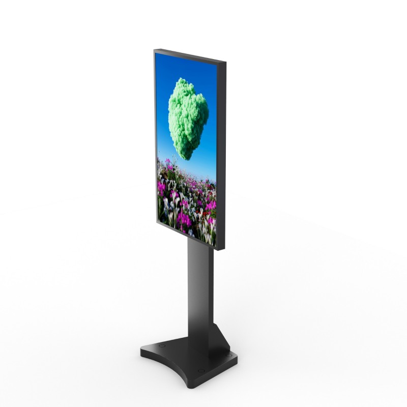 Ce dispositif publicitaire innovant présente un design élégant. Sa structure comprend un cadre métallique et un écran LCD de 43 pouces. Il s'installe facilement grâce à son pied de sol qui assure sa stabilité.