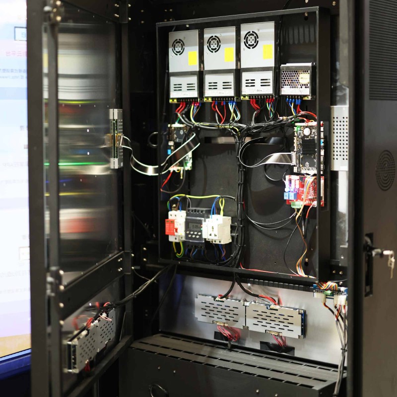 À l'intérieur, il est doté d'un temporisateur permettant de régler automatiquement les heures d'allumage et d'extinction du totem. De plus, il est possible de programmer ces horaires à l'aide d'une application dédiée.