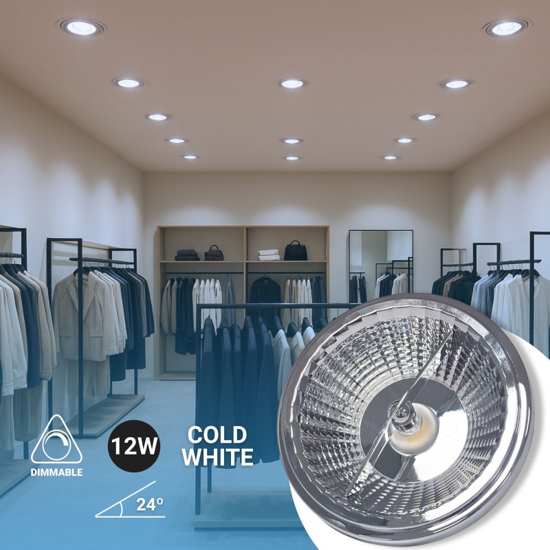 Ampoule LED AR111 dimmable avec douille GU10, disponible en blanc froid (6500K), blanc neutre (4000K) et blanc chaud (3000K).