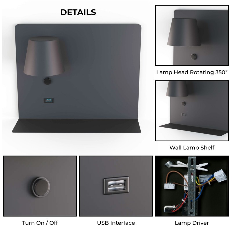 Lampe de lecture avec port USB "BASKOP" - 6W - Gauche
