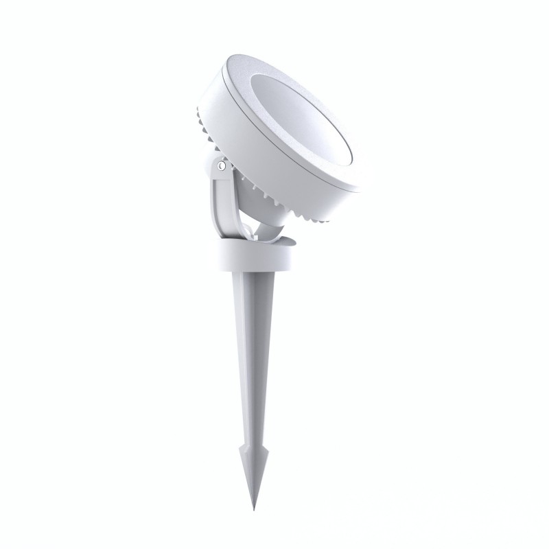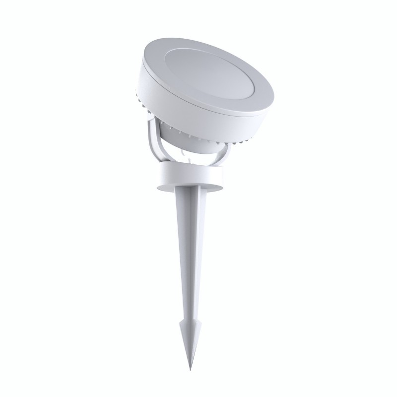 Piquet LED avec pointe et design circulaire, fabriqué en résine résistante aux chocs, à la corrosion et aux UV. Il s'installe en l'enfonçant dans le sol, l'herbe ou le sable.