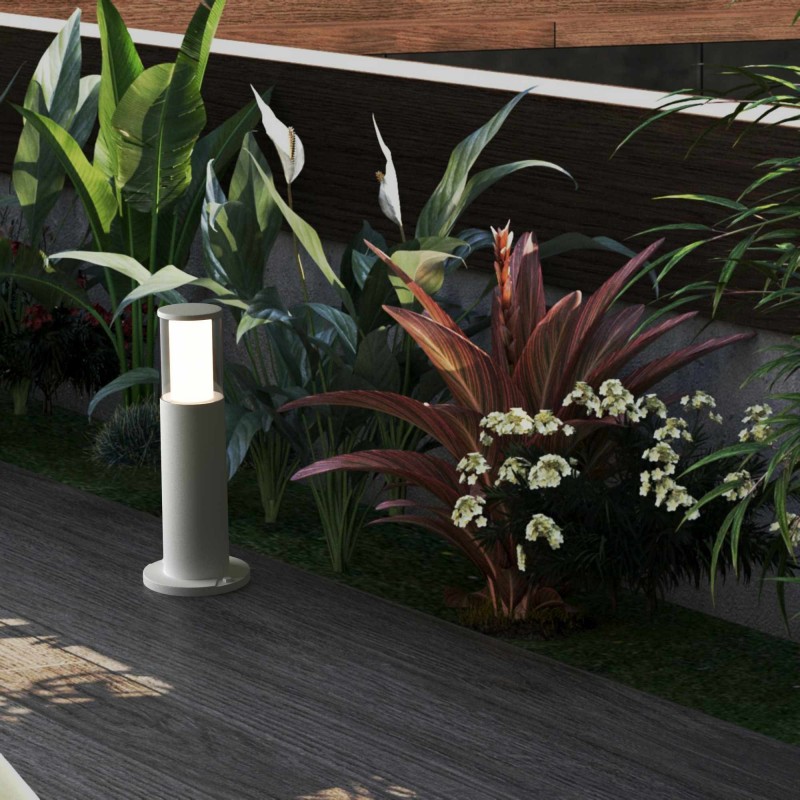 Borne de taille moyenne (40 cm) pour l'éclairage des allées, au design moderne, de forme tubulaire, réalisée en résine antichoc, résistante à la rouille, à la corrosion et aux rayons UV.