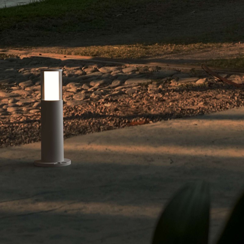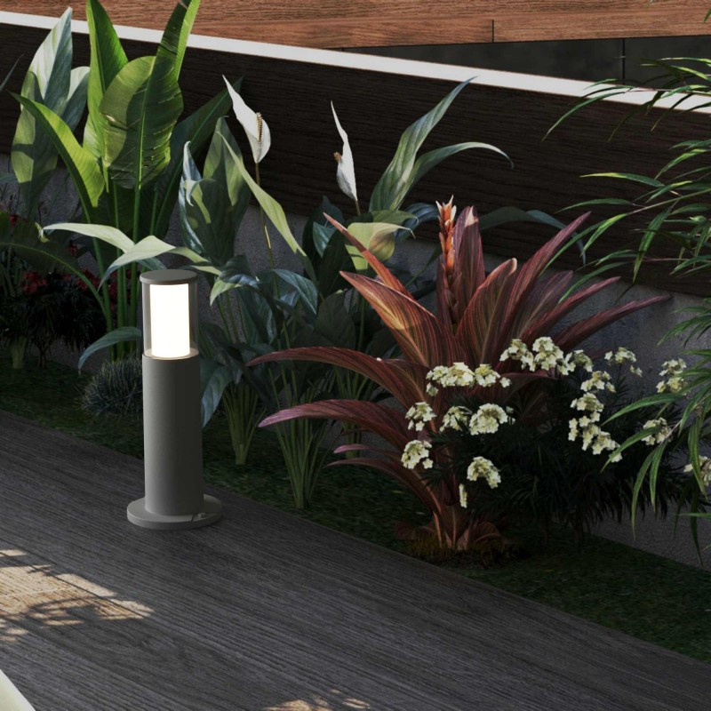 Borne de taille moyenne (40 cm) pour l'éclairage des allées, au design moderne, de forme tubulaire, réalisée en résine antichoc, résistante à la rouille, à la corrosion et aux rayons UV.