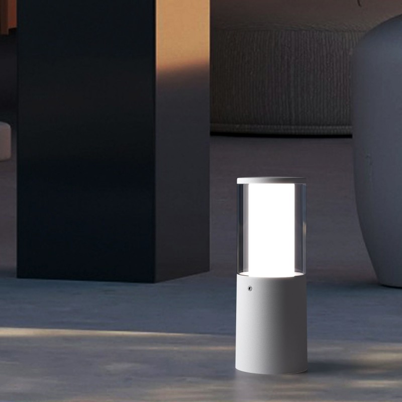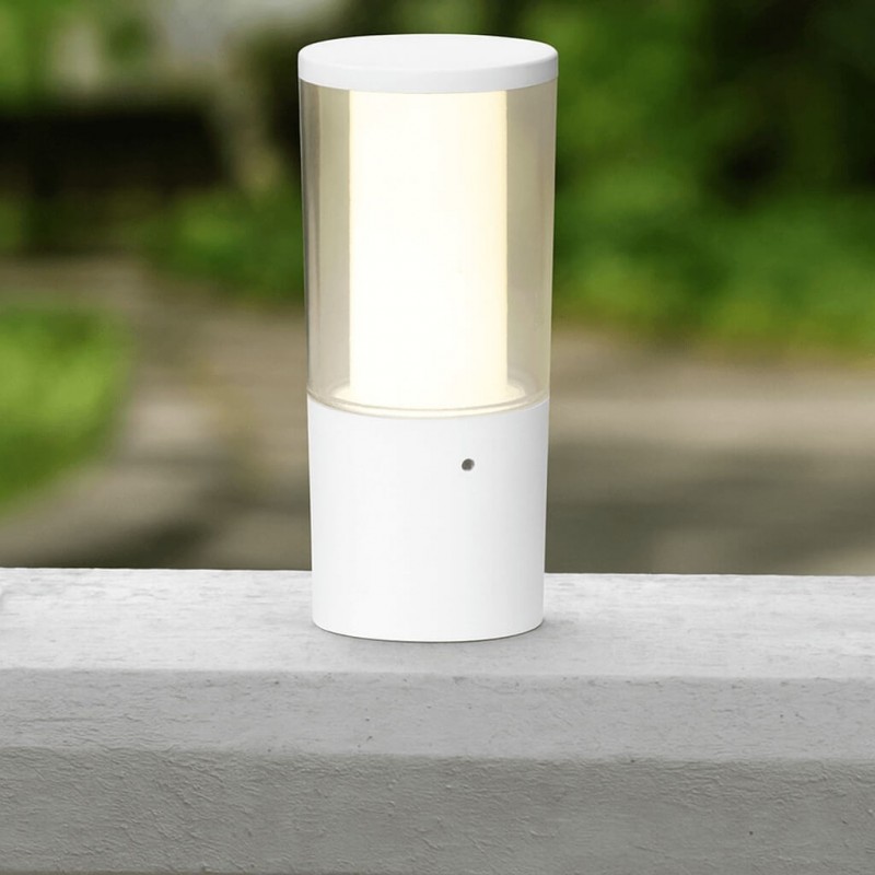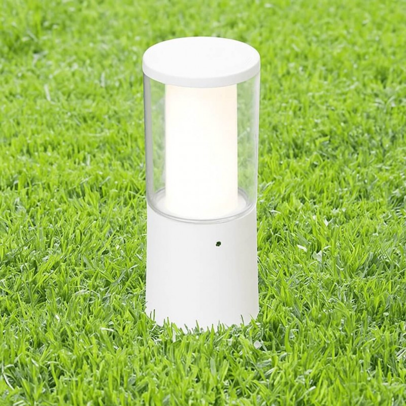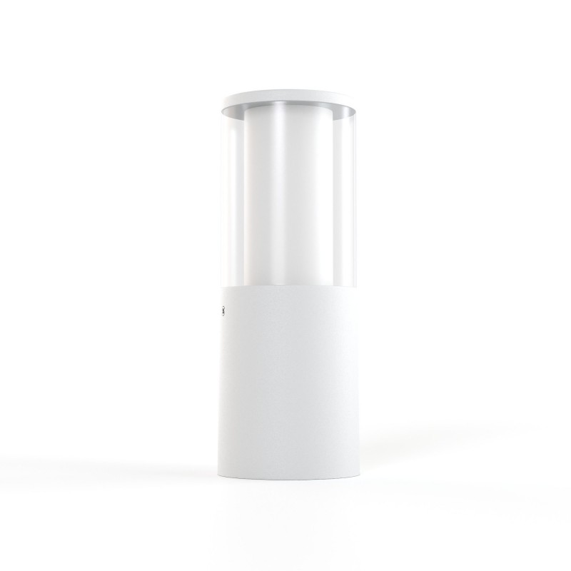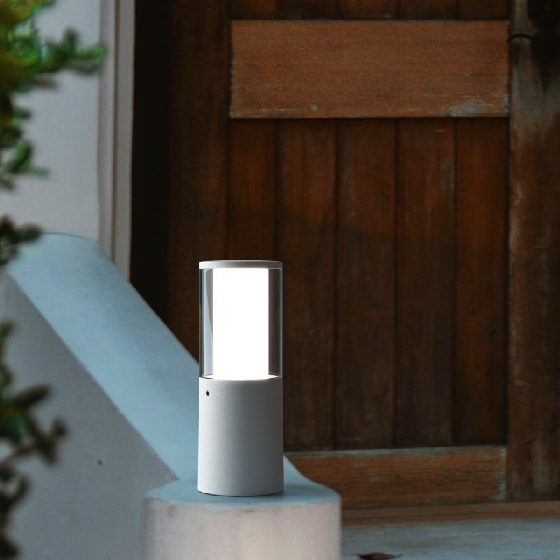 Borne de petite taille (25 cm) pour l'éclairage des allées, au design moderne, de forme tubulaire, réalisée en résine antichoc, résistante à la rouille, à la corrosion et aux rayons UV.