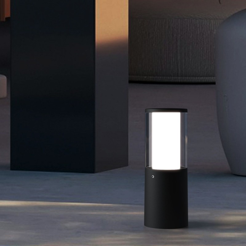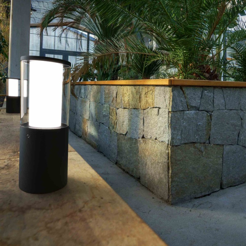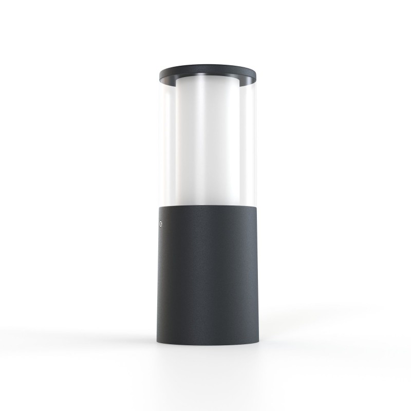Borne de petite taille (25 cm) pour l'éclairage des allées, au design moderne, de forme tubulaire, réalisée en résine antichoc, résistante à la rouille, à la corrosion et aux rayons UV.