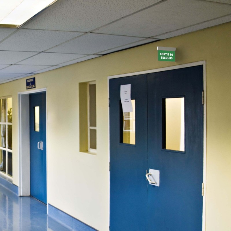 Elle est équipée de deux étiquettes autocollantes identiques, faciles à fixer sur la plaque transparente prévue à cet effet, assurant une signalisation claire pour la localisation de la sortie. Ces deux étiquettes sont fournies pour une installation de chaque côté de la plaque, garantissant ainsi une visibilité maximale.