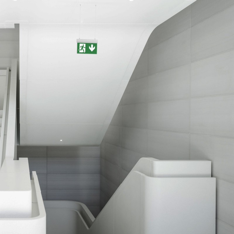 Ce luminaire de secours est conçu pour une installation suspendue au plafond. Les câbles de suspension et tout le matériel de montage requis sont inclus.