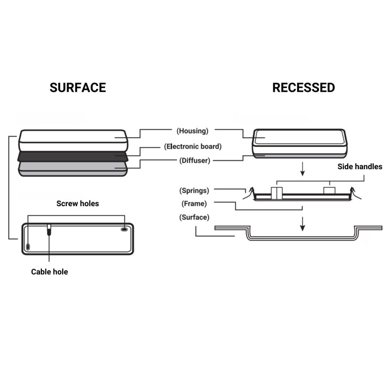 Encastré : Vous pouvez le mettre en place en remplaçant un ancien luminaire ou en faisant un nouveau trou. Après avoir réalisé la découpe nécessaire et connecté le câblage, le luminaire s'insère facilement et se fixe en place à l'aide de ses deux ailettes latérales.
