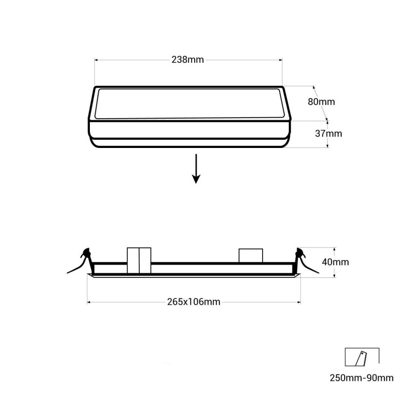 Encastré : Vous pouvez le mettre en place en remplaçant un ancien luminaire ou en faisant un nouveau trou. Après avoir réalisé la découpe nécessaire et connecté le câblage, le luminaire s'insère facilement et se fixe en place à l'aide de ses deux ailettes latérales.