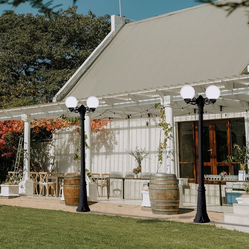 Ce luminaire comprend deux boules opales de Ø250mm en polyméthylméthacrylate (PMMA), et une base en résine anti-chocs, résistante à la rouille, à la corrosion et aux rayons UV.