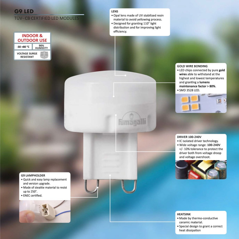 La douille G9 permet de remplacer facilement l'ampoule.  La borne LED est fournie avec une ampoule LED G9 longue durée et haute performance. Puissance de 1,7W avec une efficacité élevée de 100lm/W. Une intensité lumineuse totale de 170 lumens. Tension 100-240V. Angle d'ouverture du faisceau de 110 degrés. Lumière chaude de 3000ºK.