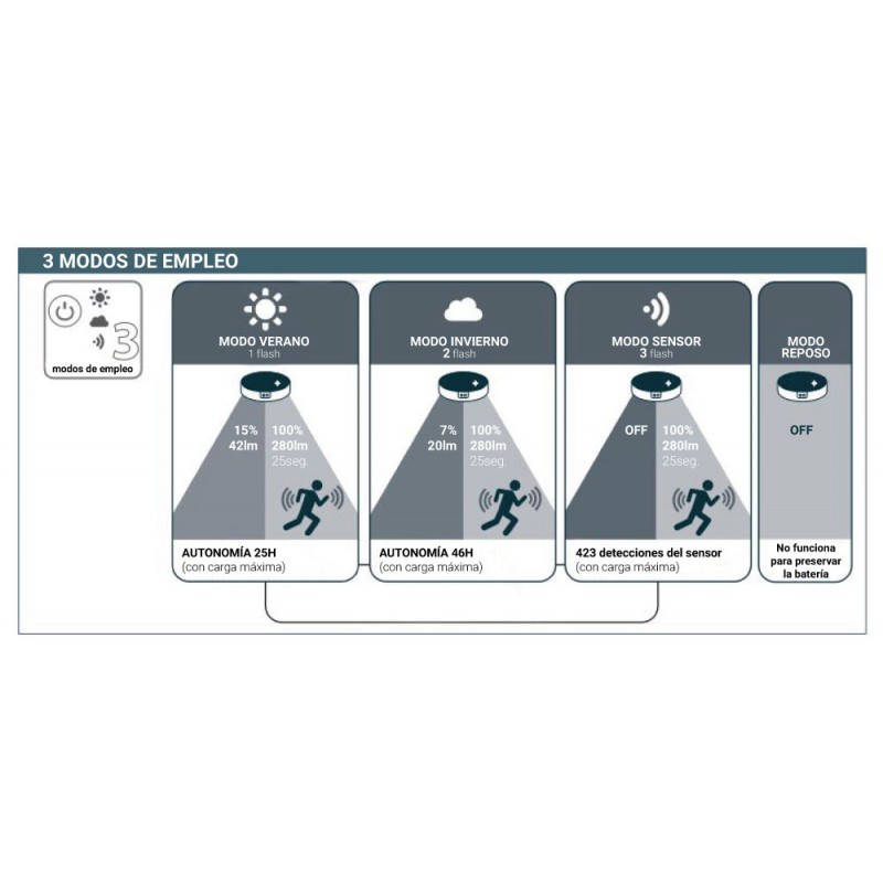 Mode été : Pour les journées ensoleillées, fonctionne avec une intensité lumineuse de 42 lumens et une autonomie de 25 heures.