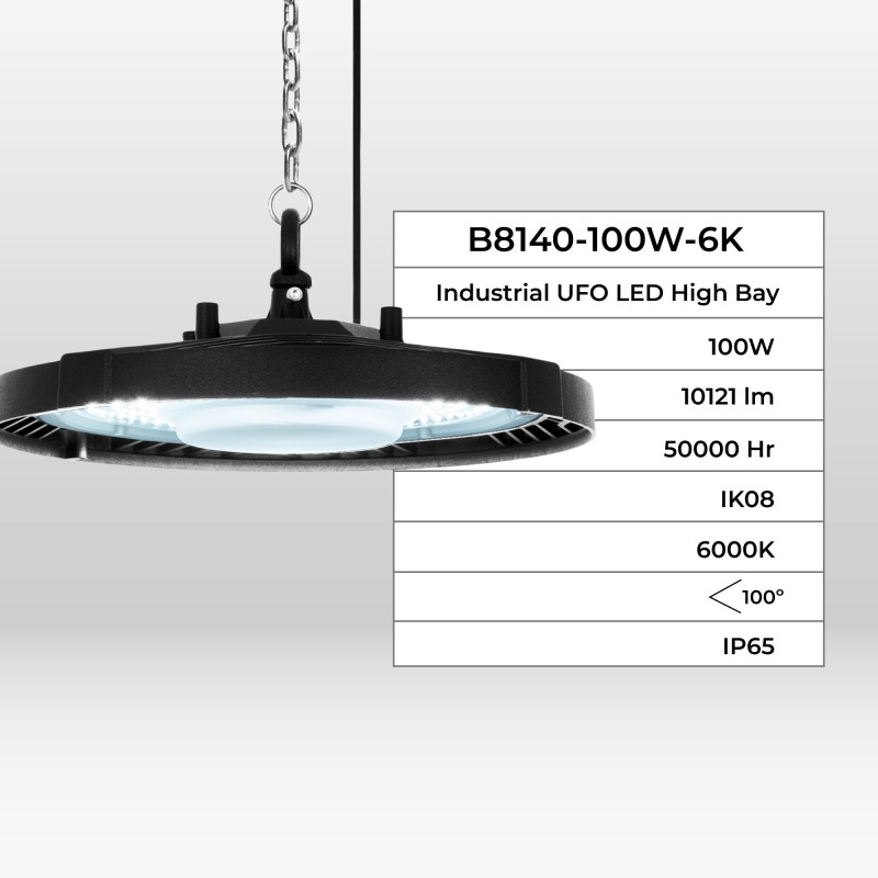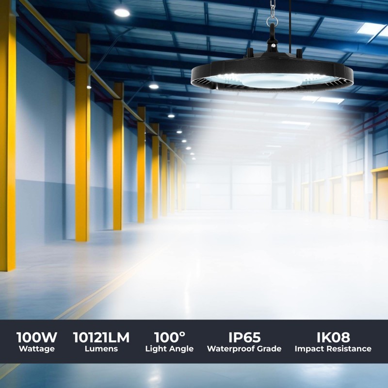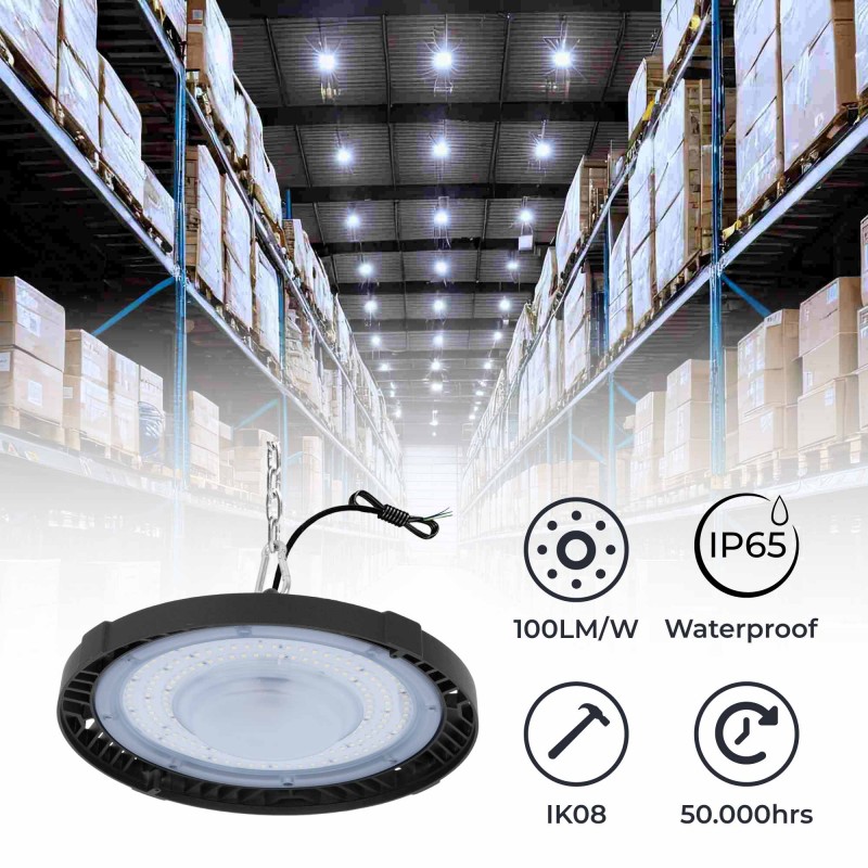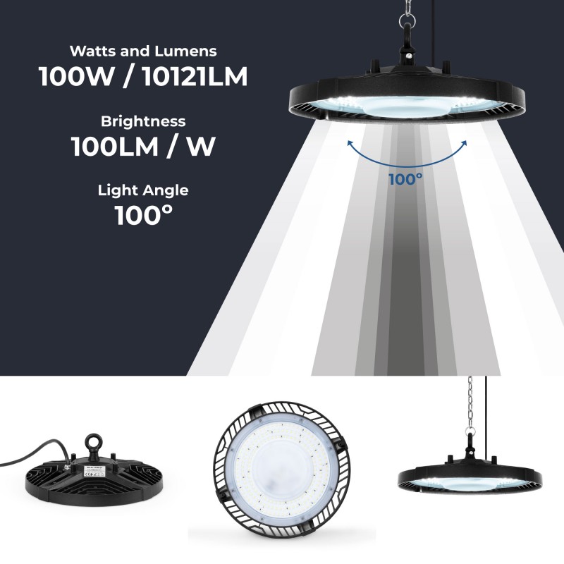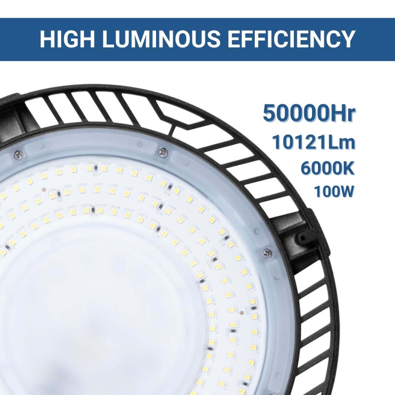 • Efficacité lumineuse élevée : Avec une puissance de 150W et une efficacité de 100 lm/W, cette cloche LED offre un éclairage puissant tout en optimisant la consommation d'énergie. Son angle d'éclairage de 100° garantit une diffusion uniforme de la lumière sur de grandes surfaces.