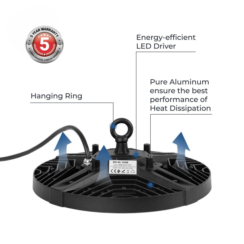 • Installation simple : Légère et facile à installer, le high bay LED peut être fixé à son crochet sur n'importe quel plafond, ce qui en fait un choix idéal pour de nombreux environnements industriels.