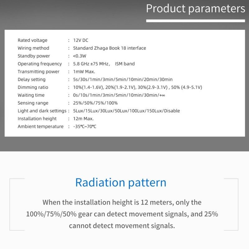 - Réglage de l'extinction : le capteur permet de régler le temps d'extinction après la détection d'un mouvement, avec des options de 5s, 30s, 1min, 3min, 5min, 10min ou 20min.