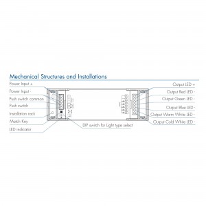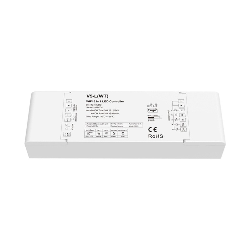- Large compatibilité : prend en charge les bandes LED 12-48V unicolores, CCT, RGB, RGBW et RGB+CCT, avec une sortie 5×6A (12-24V) ou 5×4A (36-48V).