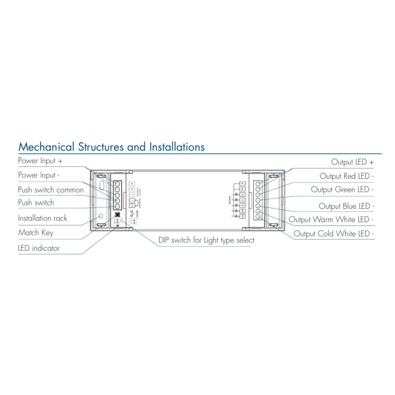 - Contrôle RF et Push-DIM : compatible avec les contrôleurs Skydance RF 2,4 GHz, permettant un contrôle multiple ; il peut également être géré par un bouton poussoir externe pour les fonctions marche/arrêt et gradation.