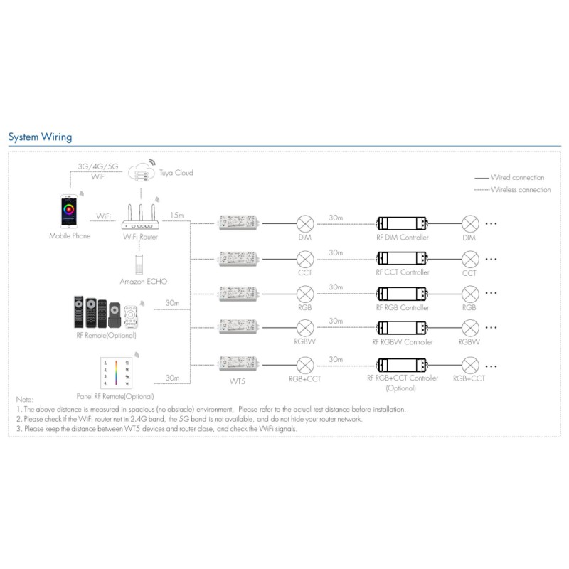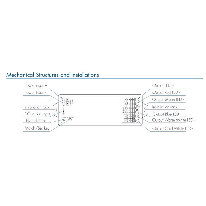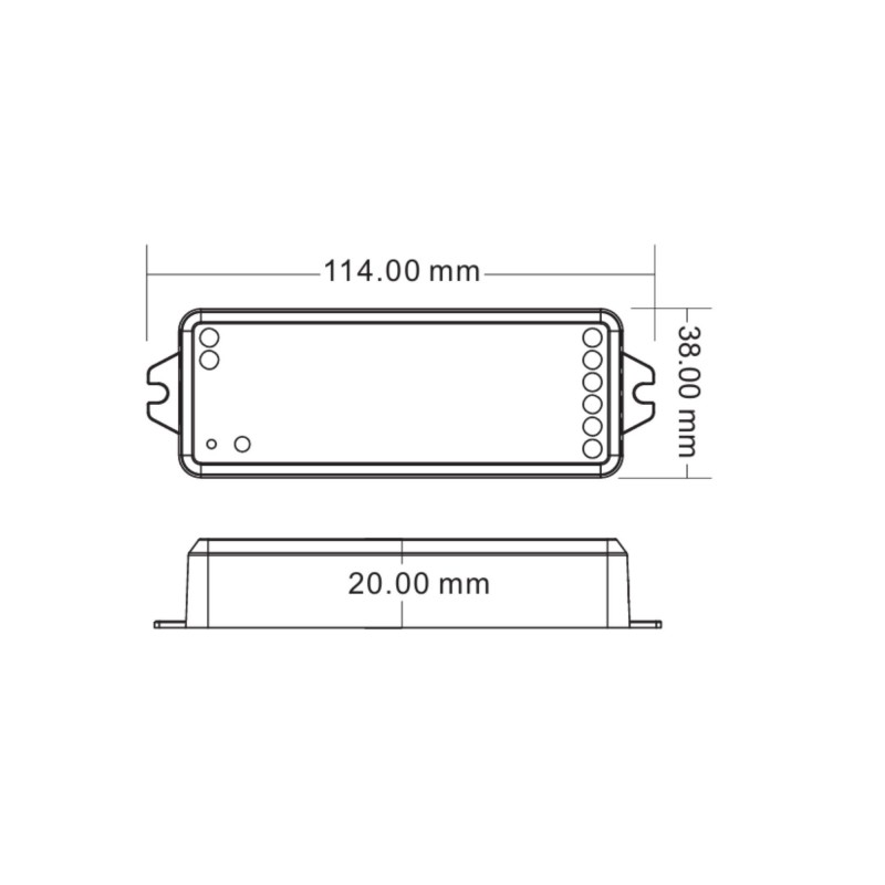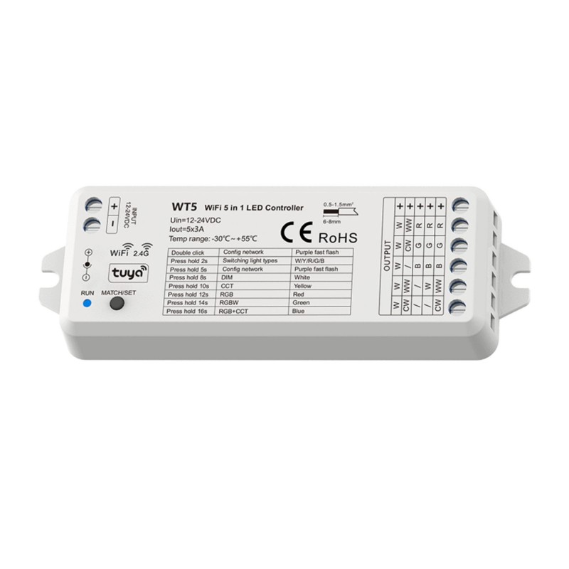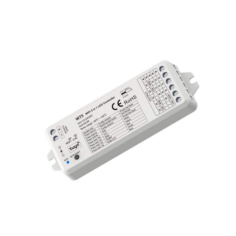 Cet appareil vous permet de gérer des bandes de LED unicolores, CCT, RGB, RGBW et RGB+CCT à partir d'un seul contrôleur, combinant le contrôle WiFi et RF 2.4GHz dans un format compact.