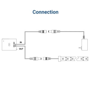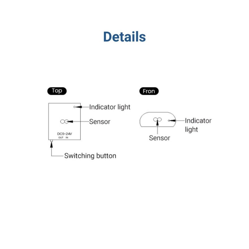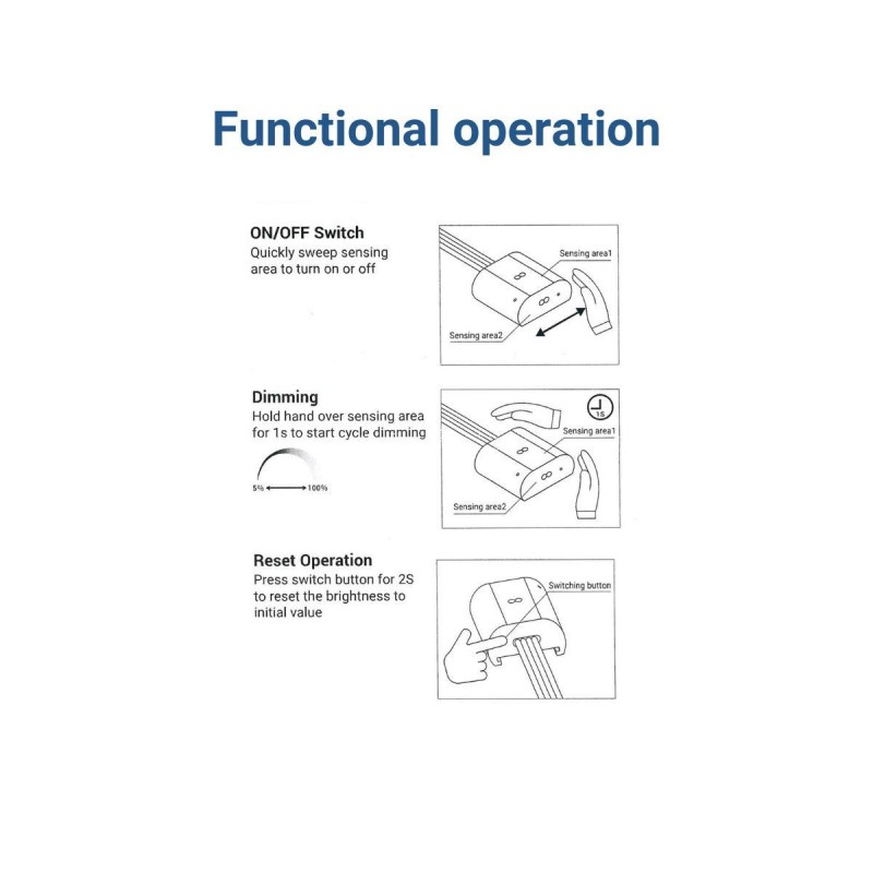 Ce capteur est hautement sensible, permettant au ruban LED de s'allumer et de s'éteindre instantanément dès qu'une main passe à une distance de 8 cm ou moins. De plus, il permet de régler l'intensité lumineuse en passant la main devant le capteur selon un cycle prédéfini (100 %~10 %~100 %), offrant un ajustement progressif et personnalisé de la luminosité.