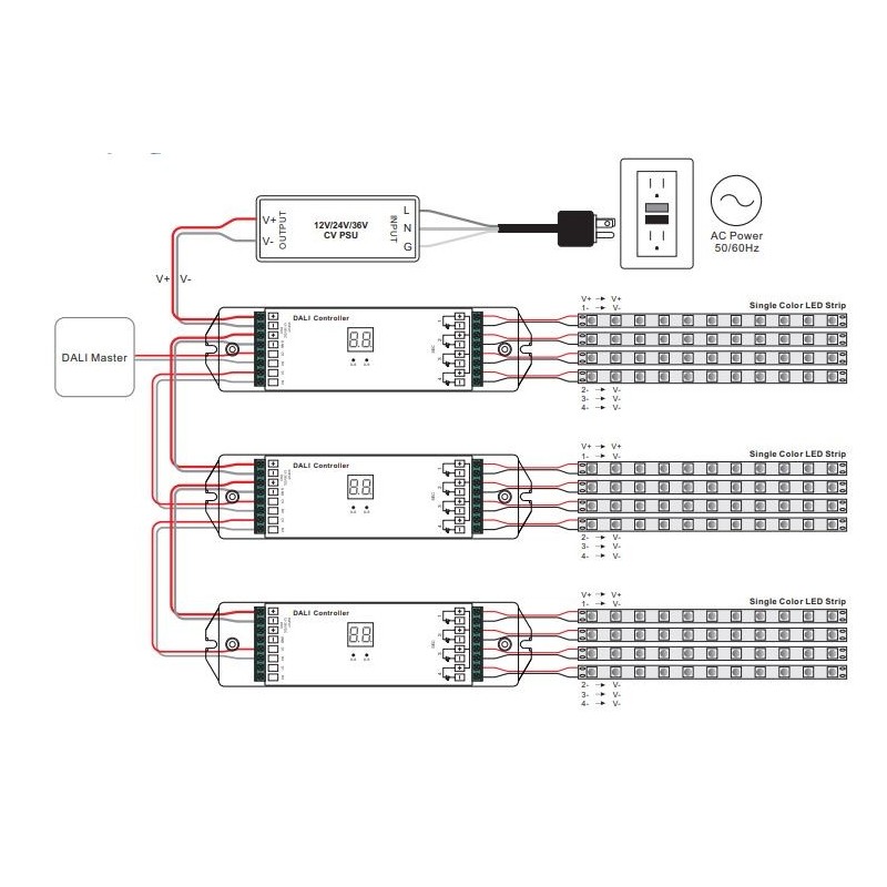L'adresse DALI peut être attribuée manuellement, affichée sur le numérique du produit ou attribuée automatiquement par les contrôleurs. 1 adresse DALI est disponible pour 4 canaux afin de fonctionner de manière simultanée. Le contrôleur DALI permet d'obtenir une variation douce de 0% à 100% par variation logarithmique, ce qui est parfait pour la vision humaine.