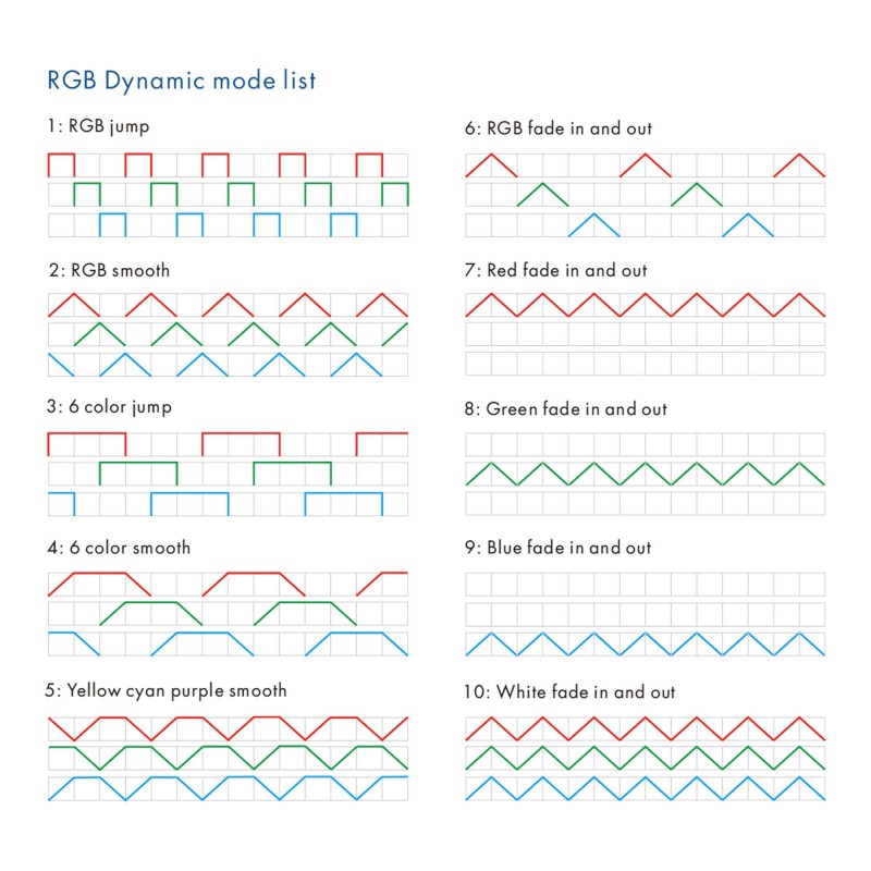 - Modes dynamiques : 10 modes prédéfinis en mode RVB, y compris des sauts et des transitions douces.