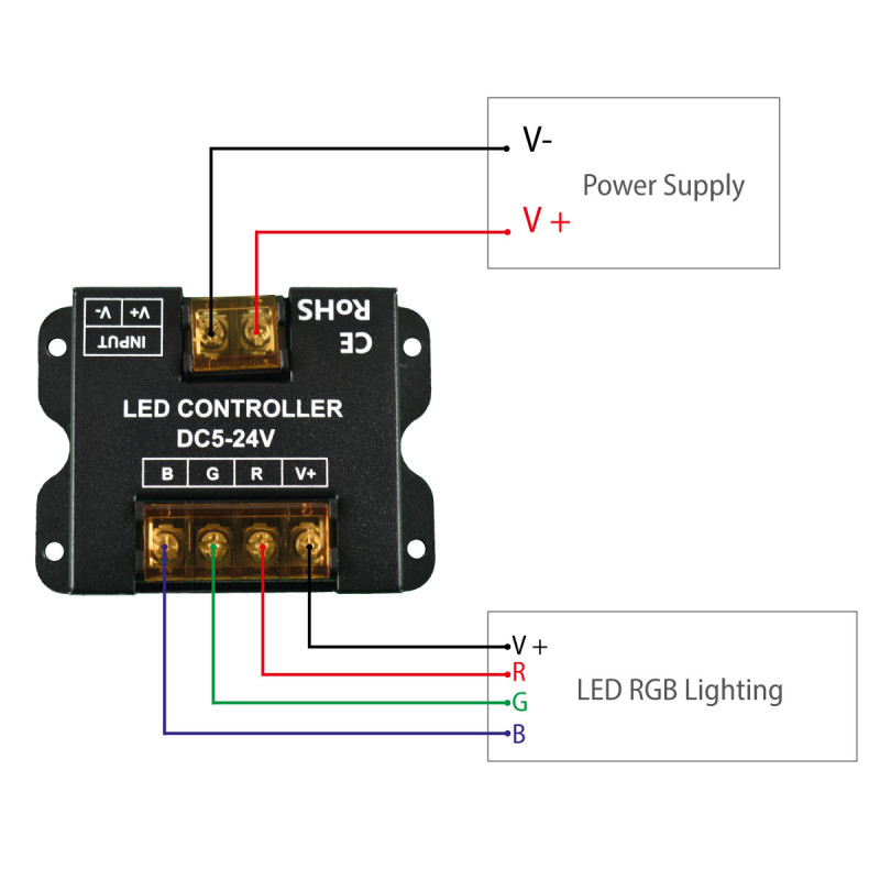 Ce contrôleur de rubans LED RVB est compatible avec la plupart des bandes LED RVB de 5V à 24V avec un courant maximum de 30A.