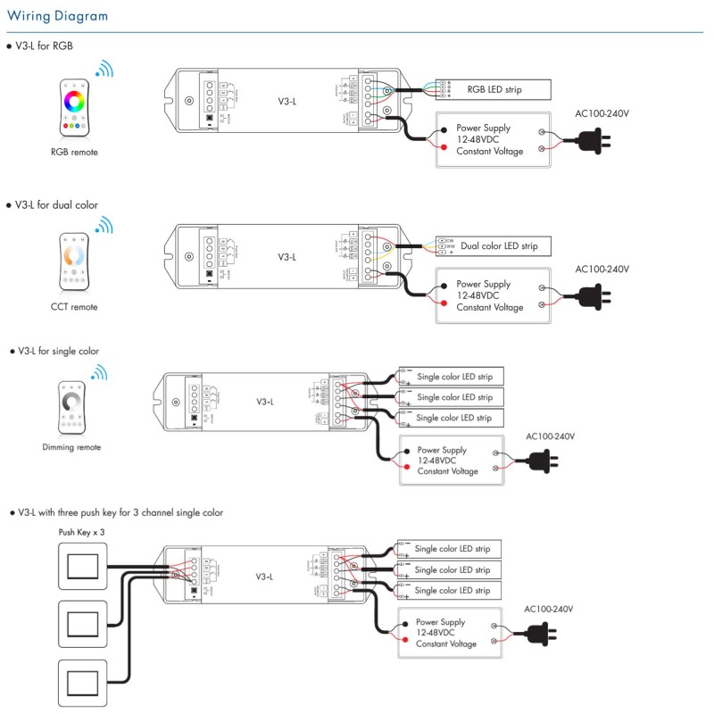 Contrôleur variateur RGB / CCT / monochrome 12-48V DC - 18A (6A/canal) - RF 2.4G - Dimmer PUSH - Skydance