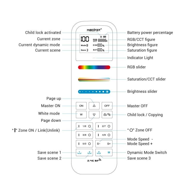 Cette télécommande est parfaitement compatible avec tous les produits Miboxer 2.4Ghz. Elle offre un contrôle précis des couleurs RGB (avec une palette de 16 millions de couleurs), de la température de couleur CCT, et de la luminosité grâce à trois barres tactiles intuitives.