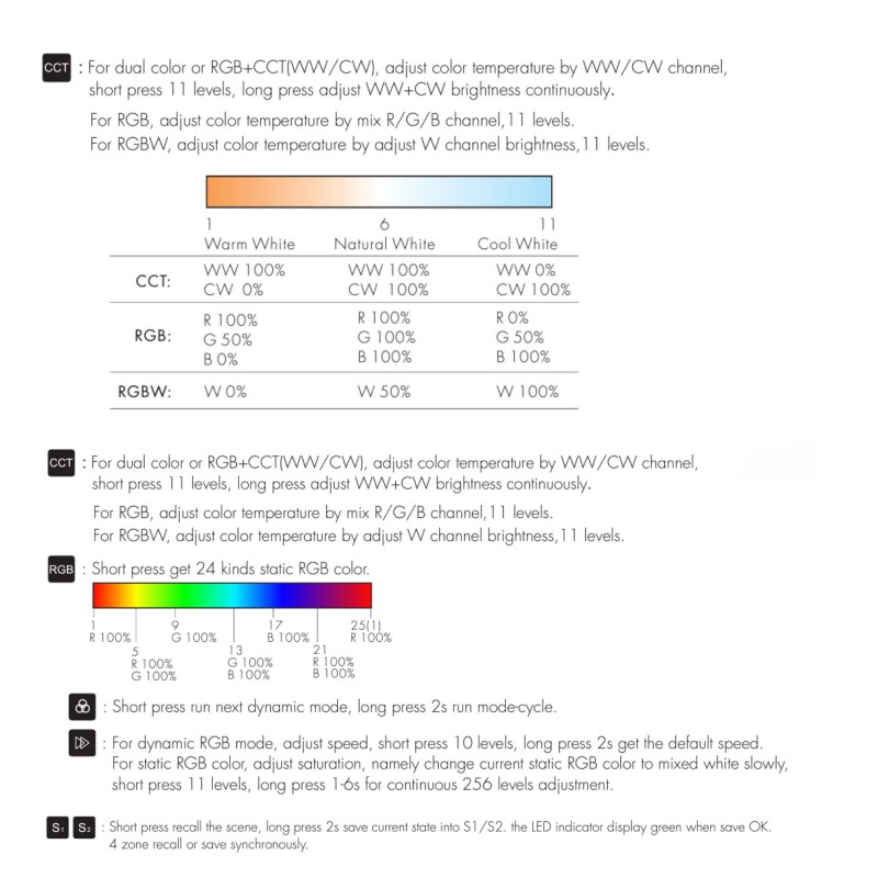 La télécommande sans fil 4 zones RGB + CCT fonctionne via un récepteur RF à la fréquence standard de 2,4 GHz, capable de transmettre le signal jusqu'à 30 mètres, même à travers les murs et les plafonds.