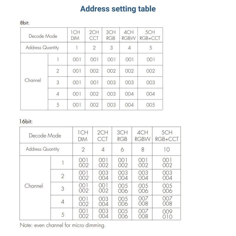 Il offre une gamme étendue de fonctionnalités, comprenant des modes de décodage de 1 à 5 canaux, divers réglages de fréquence PWM, la sélection des niveaux de gris en 8 bits ou 16 bits, ainsi que la possibilité d'ajuster la courbe de gradation. De plus, il inclut des modes de gradation RGB et 5 canaux autonomes, ainsi que 25 programmes RGB intégrés pour des effets d'éclairage impressionnants.