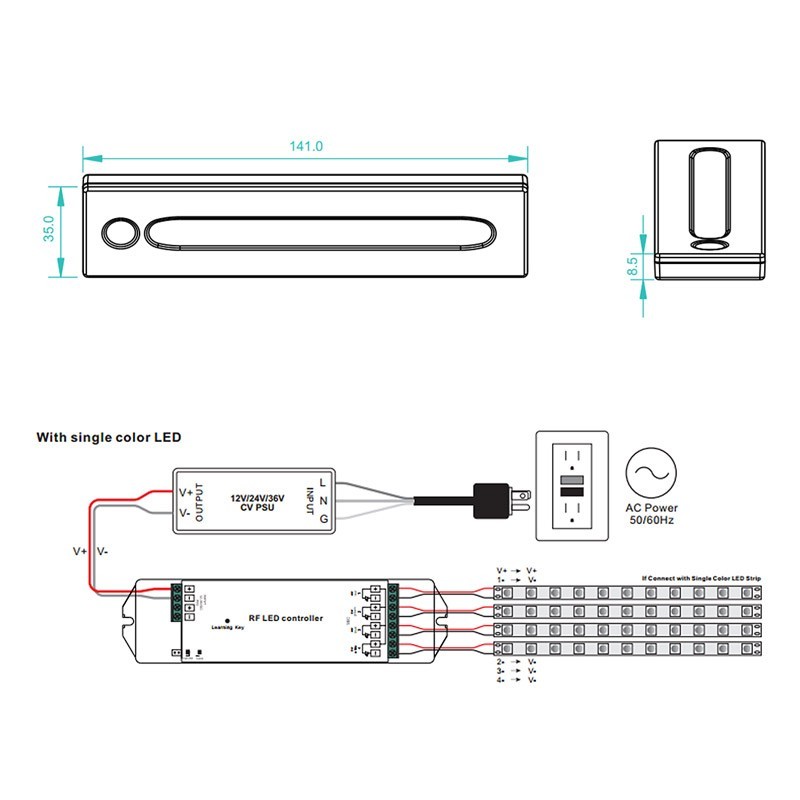 Télécommande RF pour éclairage LED monochromatique qui contrôle 1 zone avec une plage de variation de 0,1% à 100%. Le contrôleur RF est doté d'une commande tactile ultra-sensible, d'une gradation fluide sans scintillement et d'une distance de contrôle de plus de 20 mètres. Le curseur tactile de gradation logarithmique à 256 niveaux permet au gradateur d'ajuster la luminosité en douceur sans aucun scintillement, ce qui peut être très confortable pour les yeux humains. Chaque gradateur peut contrôler une zone avec un nombre infini de récepteurs dans chaque zone de manière synchrone. Le contrôleur monochrome est compatible avec les récepteurs RF de la série SR-1009, qui sont disponibles en version tension constante et courant constant pour contrôler différents types d'éclairage LED.