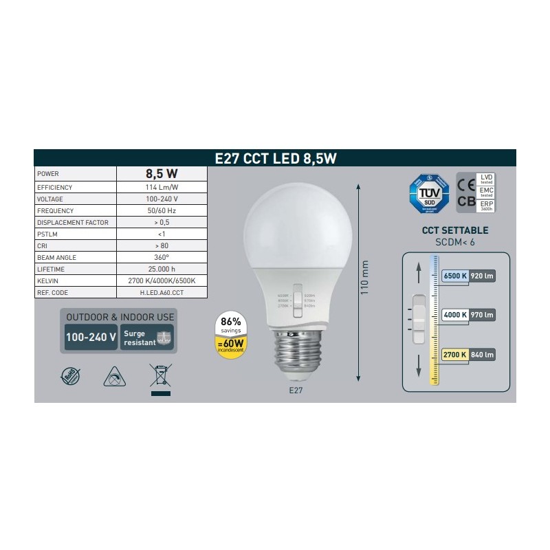 - LED incluse : Ampoule LED E27 8,5 W CCT longue durée et haute performance, offrant un éclairage à 360º.
