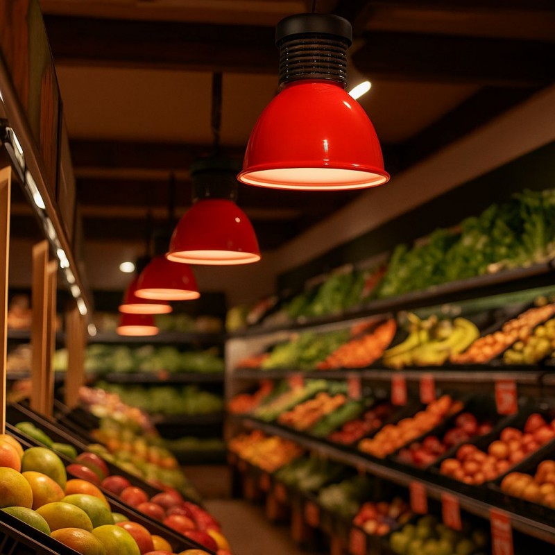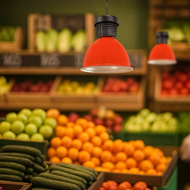 La cloche LED 30W fournit un éclairage de très haute qualité et puissance avec son chip intégré spécial pour les fruits et légumes. Sa fonction est de mettre en valeur les couleurs des produits, en les éclairant correctement et de façon réaliste et attractive pour les consommateurs. De plus, son angle lumineux de 90º est idéal pour des installations dans ce type de magasins.