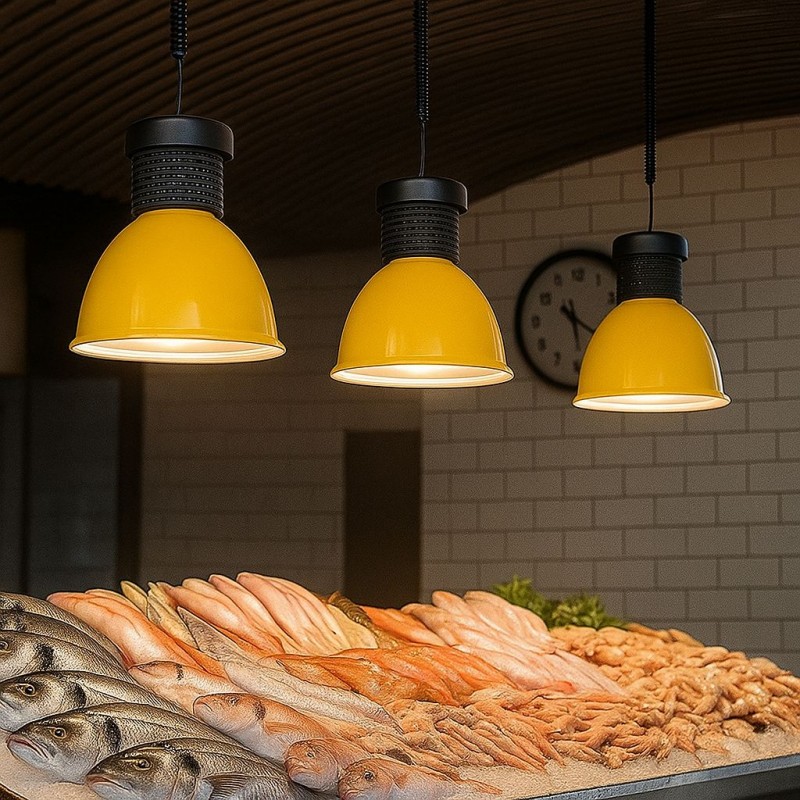 La cloche LED 30W fournit un éclairage de très haute qualité et puissance avec son chip intégré spécial pour les poissonneries. Sa fonction est de mettre en valeur les couleurs des produits, en les éclairant correctement et de façon réaliste et attractive pour les consommateurs. De plus, son angle lumineux de 90º est idéal pour des installations dans ce type de magasins.