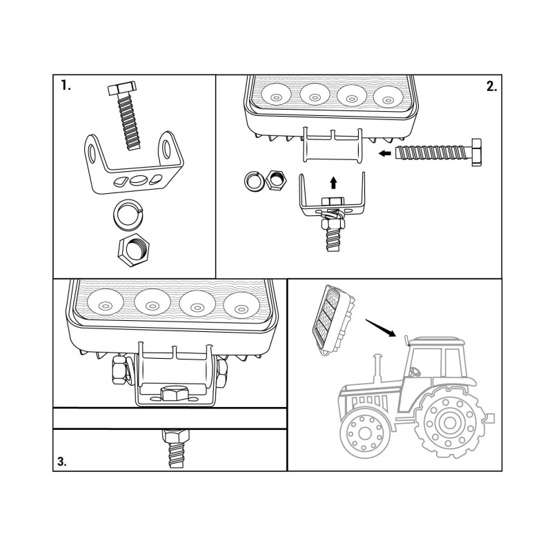 L'installation requiert de percer un trou dans le pare-chocs, la barre du véhicule ou la surface choisie pour le montage du projecteur. Si la surface est plus épaisse que la longueur de la vis fournie, veillez à utiliser une vis de même diamètre mais de longueur supérieure. Une fois installé, ce projecteur peut être ajusté pour orienter le spot vers le haut ou le bas, selon vos besoins.