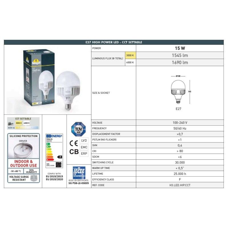 - Système CCT graduable: permet de choisir entre le blanc chaud (3000K) et le blanc neutre (4000K) grâce à un interrupteur intégré à l'ampoule.