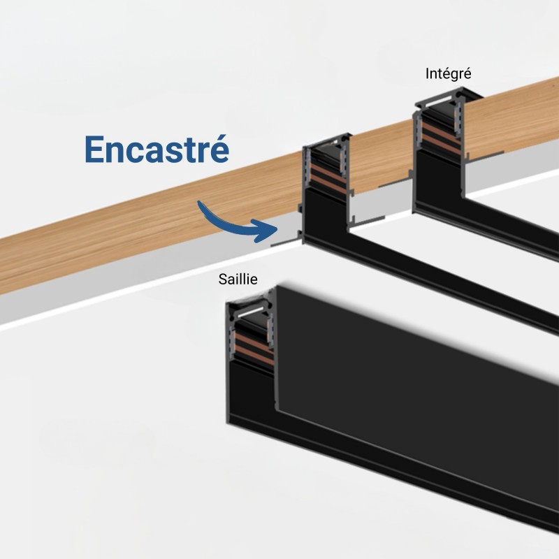 Le rail peut être encastré dans les plafonds ou les murs en placoplâtre, aussi bien verticalement qu'horizontalement. En outre, il peut être combiné avec d'autres sections de rail, formant ainsi différentes configurations, en fonction des exigences de chaque projet.