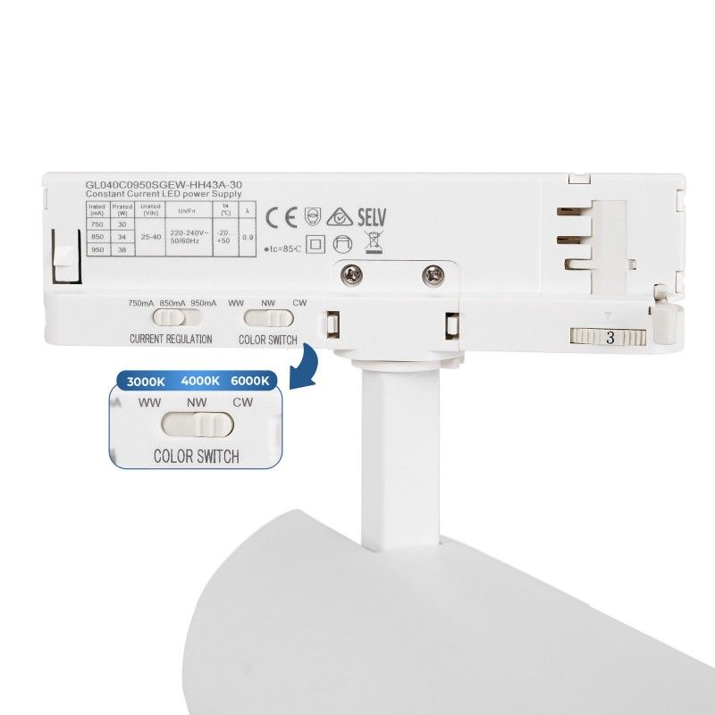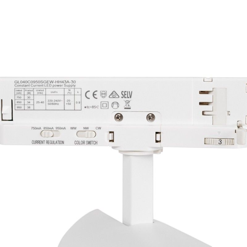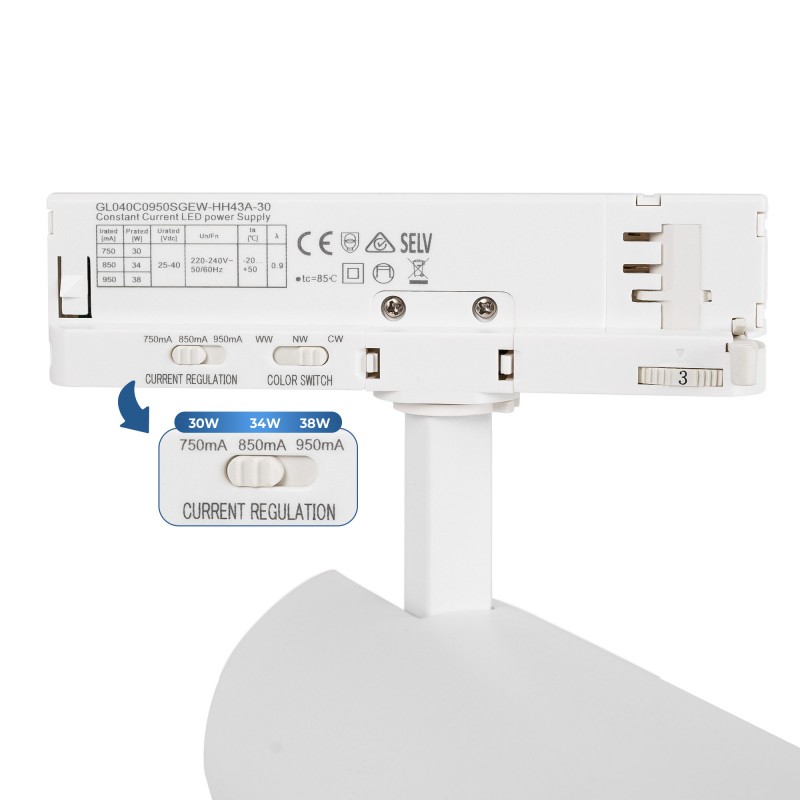 Projecteur LED pour rail triphasé avec puissance réglable entre 30W, 34W et 38W.