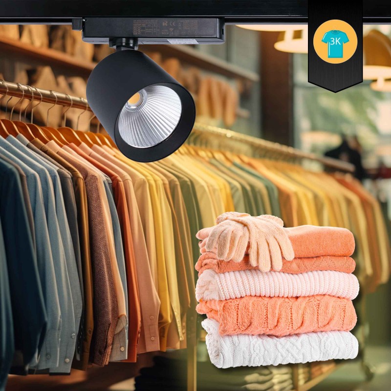 Spot LED monophasé de 40W pour les boutiques de mode et les magasins de détail, doté d'une puce LED spéciale qui met en valeur les couleurs et les textures des vêtements, incitant les clients à l'achat.