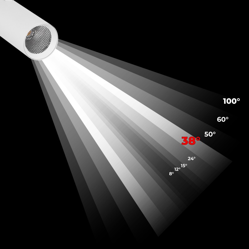 • Éclairage ciblé : angle d'ouverture de 38° qui concentre la lumière sur des zones spécifiques, idéal pour mettre en valeur des produits ou des objets.
