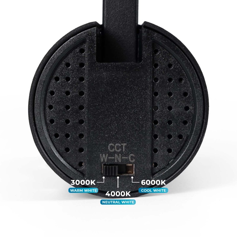 - CCT réglable : lumière chaude (3000K), neutre (4000K) ou froide (6000K), configurable à partir d'un dip-switch à l'arrière pour s'adapter à différents environnements.
