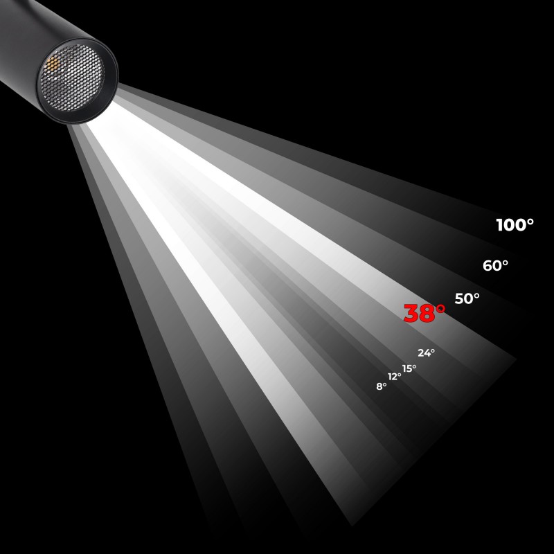 - Éclairage ciblé : angle d'ouverture de 38° qui concentre la lumière sur des zones spécifiques, idéal pour mettre en valeur des produits ou des objets.