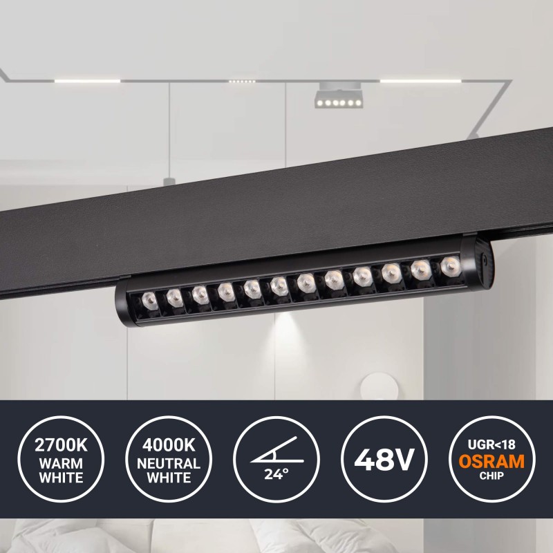 Spot LED linéaire orientable pour rail magnétique 48V - 12W, avec puce LED OSRAM.