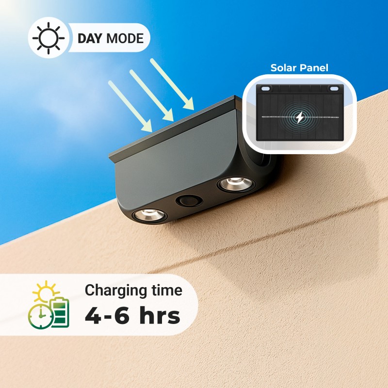 - Alimentation solaire et charge rapide : intègre un panneau solaire monocristallin (4,5 V / 1,8 W), avec un temps de charge de seulement 4 à 6 heures en cas d'ensoleillement intense (>40000 lux).