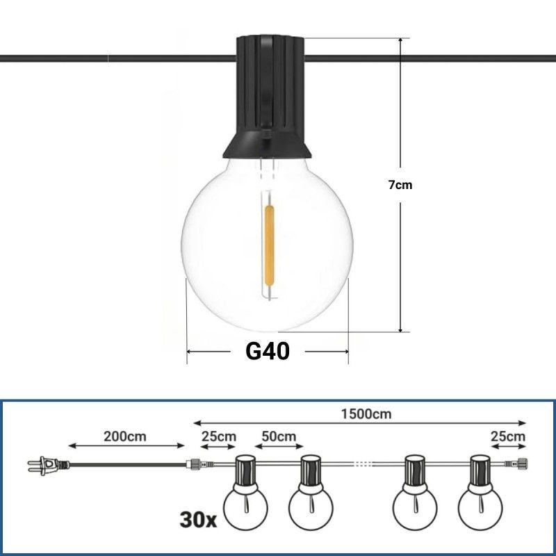 Guirlande guinguette d'extérieur 15 + 2 mètres - 30 ampoules LED à filament E12 G40 1W - IP44 - Blanc chaud