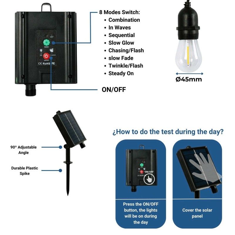 Le panneau solaire est doté de deux boutons pratiques : l'un pour allumer/éteindre la guirlande et l'autre pour ajuster l'éclairage parmi 8 modes dynamiques prédéfinis (combinaison, scintillement, fondu lent, vague, séquentiel, etc.). Un test de fonctionnement en journée est également possible en appuyant simplement sur le bouton On/Off lorsque le panneau solaire est couvert ; les ampoules s'allument pour indiquer le bon fonctionnement de la guirlande.