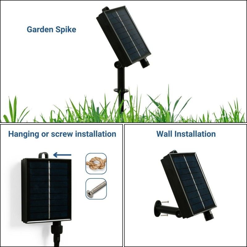 Ce luminaire extérieur incorpore un panneau solaire de 4,5V / 280mA à batterie, offrant une grande flexibilité d'installation grâce à son angle d'orientation de 90º et son piquet pour l'ancrage dans le sol, le sable ou l'herbe. De plus, un support est inclus pour une installation au sol ou sur les murs, avec possibilité d'ajustement via des vis, et il dispose également d'un trou dans la partie supérieure du panneau pour une installation suspendue avec une corde.